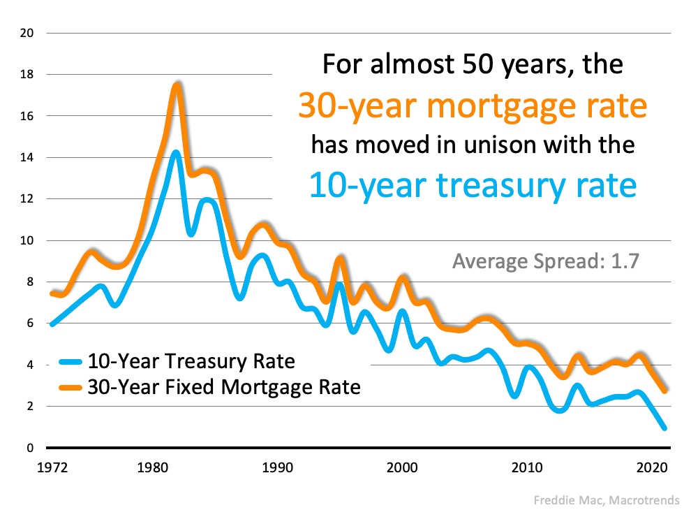 Many things impact mortgage rates. The economy, inflation, and Fed policy, just to name a few. That makes forecasting rates difficult. However, there’s one metric that has held up over the last fifty years – the relationship between mortgage rates and the 10-year treasury rate. Here’s a graph detailing this relationship since Freddie Mac started keeping mortgage rate records in 1972:The Reason Mortgage Rates Are Projected to Increase and What It Means for You | Simplifying The MarketThere’s no denying the close relationship between the two. Over the last five decades, there’s been an average 1.7-point spread between these two rates. It’s this long-term relationship that has some forecasters projecting an increase in mortgage rates as we move throughout the year. This is based on the recent surge in the 10-year treasury rate shown here:The Reason Mortgage Rates Are Projected to Increase and What It Means for You | Simplifying The MarketThe spread between the two is now 1.53, indicating mortgage rates could rise. Actually, a bump-up in rate has already begun. As Joel Kan, Associate VP of Economic Forecasting for the Mortgage Bankers Association, reveals: