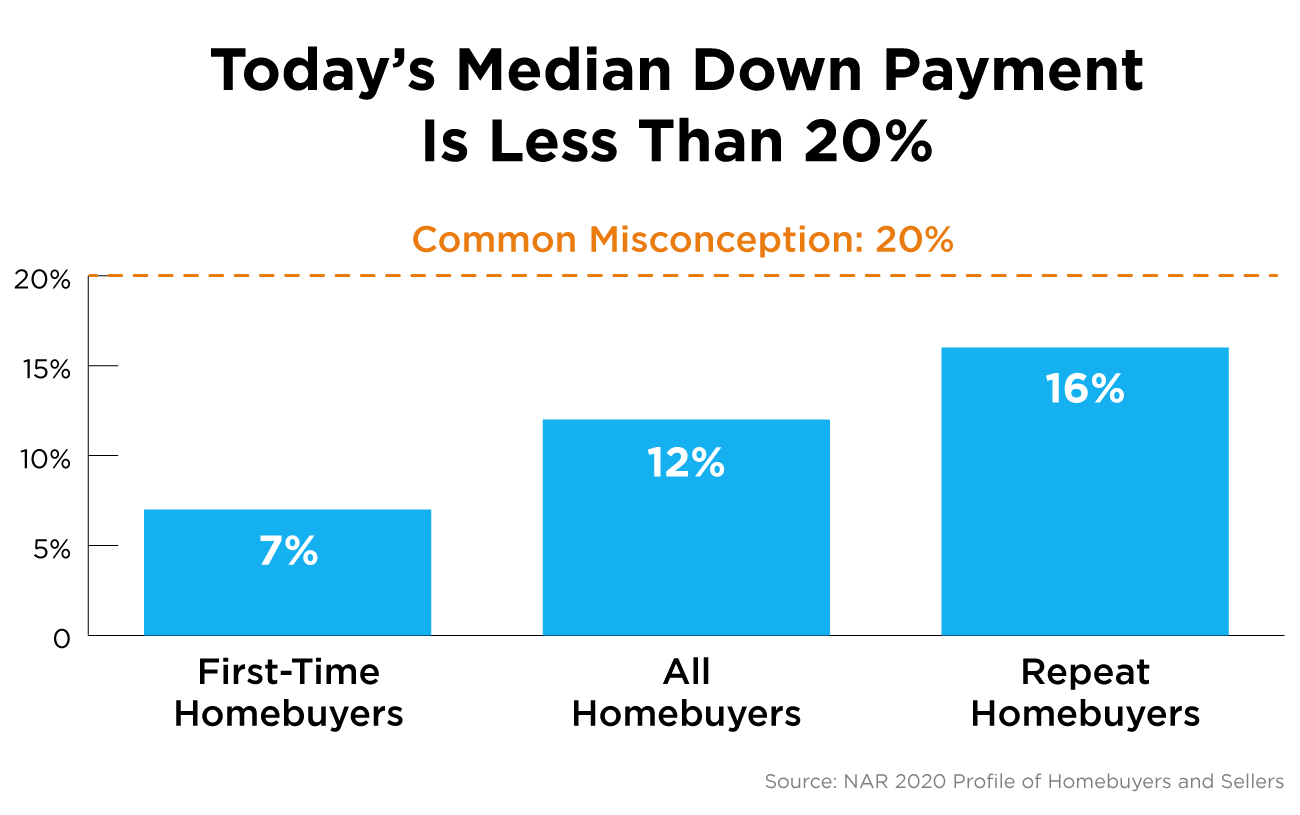 Is the idea of saving for a down payment holding you back from buying a home right now? You may be eager to take advantage of today’s low mortgage rates, but the thought of needing a large down payment might make you want to pump the brakes. Today, there’s still a common myth that you have to come up with 20% of the total sale price for your down payment. This means people who could buy a home may be putting their plans on hold because they don’t have that much saved yet. The reality is, whether you’re looking for your first home or you’ve purchased one before, you most likely don’t need to put 20% down. Here’s why.