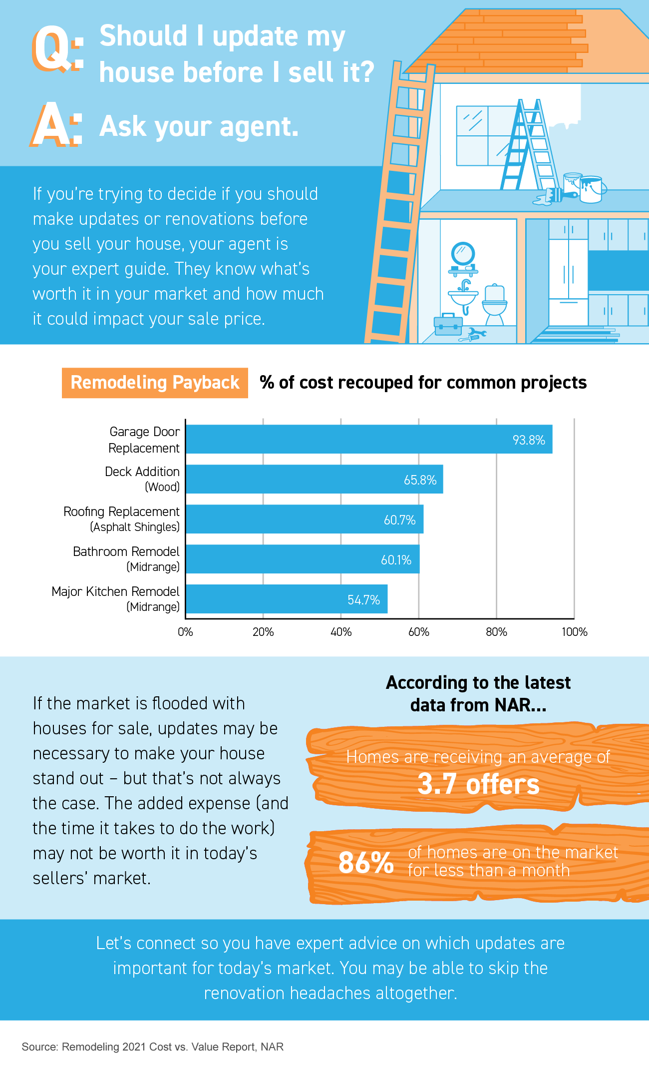- If you’re deciding whether you should make updates before you sell your house, lean on your agent to be your guide.